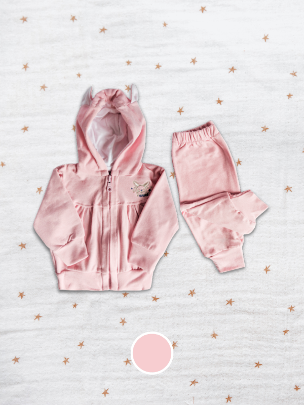 Conjunto Minis de beba en rústico esmerilado. El set de dos prendas incluye una campera con orejitas y un pantalón con puño.