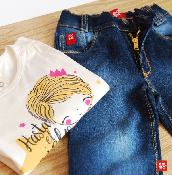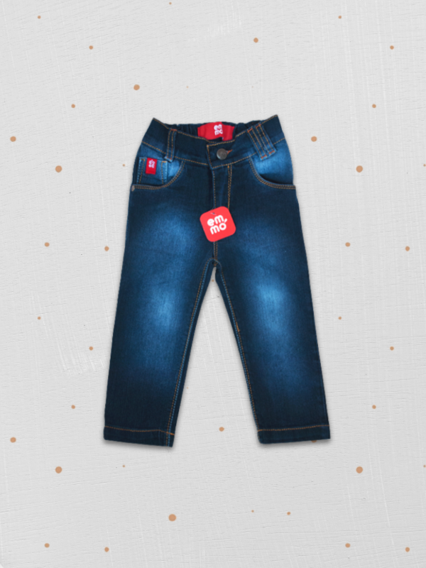 Pantalón de jean azul de beba con efecto desgastado y cintura elastizada en la parte trasera para un calce cómodo.